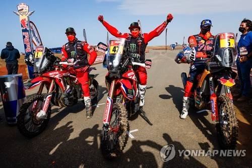 epa08938937 A handout photo made available by ASO of Kevin Benavides of Argentina, Honda, Monster Energy Honda Team 2021, celebrating winning the Bike section after the 12th and final stage of the Dakar 2021 between Yanbu and Jeddah, in Saudi Arabia, 15 January 2021. At left is Ricky Brabec of thw US who placed second and right Sam Sunderland of Great Britain who placed third. EPA/Florent Gooden HANDOUT via ASO SHUTTERSTOCK OUT HANDOUT EDITORIAL USE ONLY/NO SALES/NO ARCHIVES