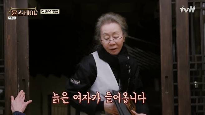 이날 윤여정은 외국인 손님들의 저녁 식사를 응대하며 "올드 레이디가 들어간다"며 입담을 뽐냈다.