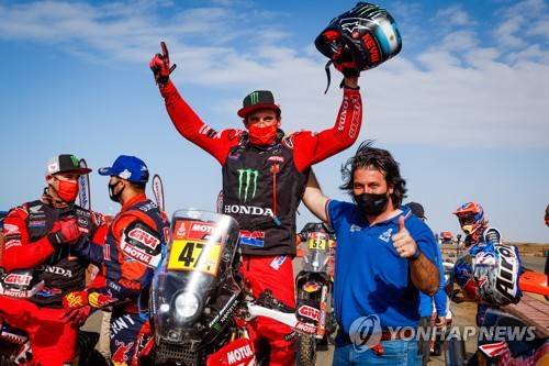 epa08938977 A handout photo made available by ASO of Kevin Benavides of Argentina, Honda, Monster Energy Honda Team 2021, joined by David Castera, Director of the Dakar Rally, celebrating winning the Bike section after the 12th and final stage of the Dakar 2021 between Yanbu and Jeddah, in Saudi Arabia, 15 January 2021. EPA/Florent Gooden HANDOUT via ASO SHUTTERSTOCK OUT HANDOUT EDITORIAL USE ONLY/NO SALES/NO ARCHIVES