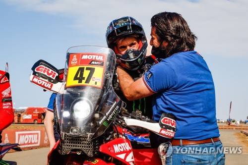 epa08938981 A handout photo made available by ASO of Kevin Benavides of Argentina, Honda, Monster Energy Honda Team 2021, joined by David Castera, Director of the Dakar Rally, celebrating winning the Bike section after the 12th and final stage of the Dakar 2021 between Yanbu and Jeddah, in Saudi Arabia, 15 January 2021. EPA/Florent Gooden HANDOUT via ASO SHUTTERSTOCK OUT HANDOUT EDITORIAL USE ONLY/NO SALES/NO ARCHIVES