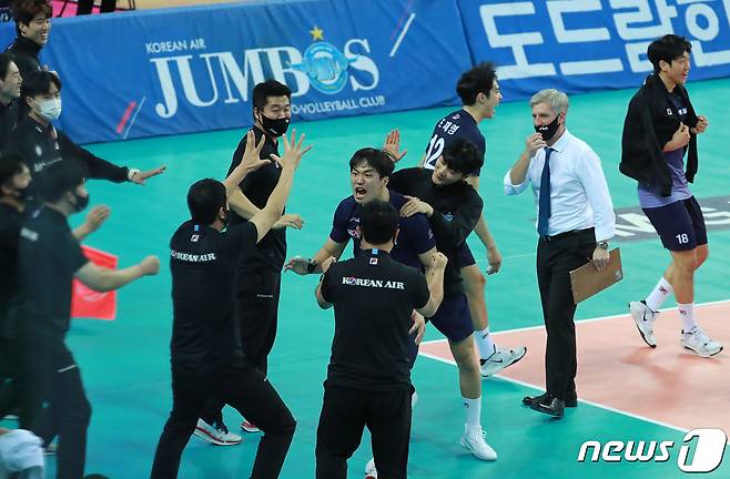 (인천=뉴스1) 구윤성 기자 = 15일 오후 인천계양체육관에서 열린 프로배구 '도드람 2020-2021 V리그' 대한항공과 KB손해보험의 경기에서 KB손해보험을 상대로 세트스코어 3대 2 승리를 거둔 대한항공 선수들이 환호하고 있다. 2021.1.15/뉴스1