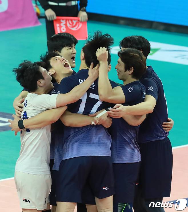 (인천=뉴스1) 구윤성 기자 = 15일 오후 인천계양체육관에서 열린 프로배구 '도드람 2020-2021 V리그' 대한항공과 KB손해보험의 경기에서 KB손해보험을 상대로 세트스코어 3대 2 승리를 거둔 대한항공 선수들이 환호하고 있다. 2021.1.15/뉴스1