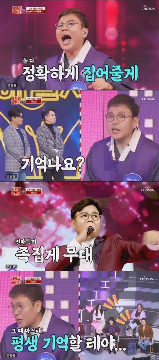 정승제는 MC 김성주와 붐에게 “제가 ‘미스터트롯’에 출연했던 것 기억나냐. 직장부 B조에 있었다”고 밝혔다. “당시 하트를 몇 개 받았었냐”는 질문에 정승제는 “11개 받았다”고 밝혔다. 출연자들이 “2개만 더 받았으면”이라며 안타까워하자 정승제는 “박명수님과 이무송님 평생 기억할거야”라고 말해 웃음을 안겼다.(사진=TV조선 ‘사랑의 콜센타’ 캡처)