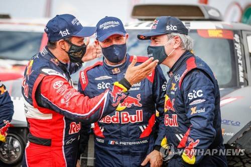 epa08938996 A handout photo made available by ASO of (from left) Nasser Al-Attiyah Nasser of Qatar, Toyota, Toyota Gazoo Racing Stephane Peterhansel of France, Mini, X-Raid Mini JCW Team, and Carlos Sainz of Spain, Mini, X-Raid Mini JCW Team after the 12th and final stage of the Dakar 2021 between Yanbu and Jeddah, in Saudi Arabia, 15 January 2021. Peterhansel won the Car section, Al-Attiyah placed second and Carlos Sainz third. EPA/Antonin Vincent HANDOUT via ASO SHUTTERSTOCK OUT HANDOUT EDITORIAL USE ONLY/NO SALES/NO ARCHIVES