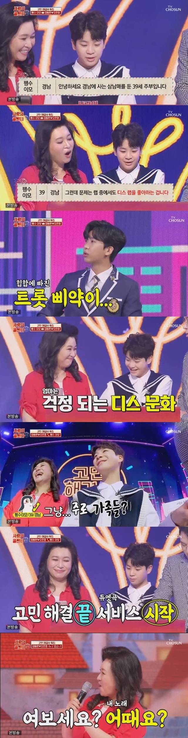 시청자는 10살 은혁이가 주로 가족들을 디스해 고민이라고 털어놨다. 이에 오은영은 “아이가 랩을 하면서 좋아한다. 인간은 희로애락이 다 있지 않나. 부정적인 감정을 표현하지 않는 게 더 문제다. 편안하게 생각하셨으면 좋겠다”고 조언했다. 이어 오은영, 정동원은 한영애의 ‘누구없소’를 듀엣으로 열창했다. (사진=TV조선 ‘사랑의 콜센타’ 캡처)