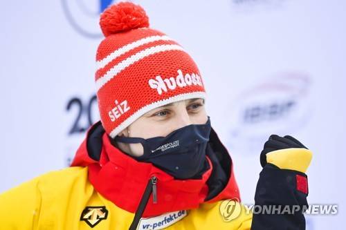 epa08939056 Tina Hermann of Germany celebrates after winning the women's Skeleton World Cup event in St. Moritz, Switzerland, 15 January 2021. EPA/GIAN EHRENZELLER