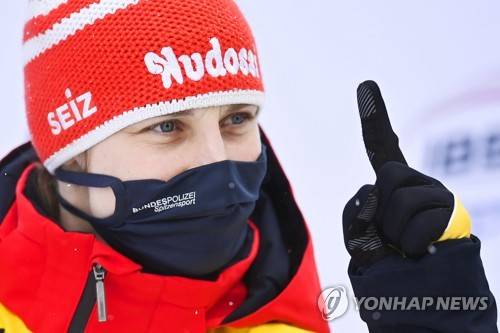 epa08939058 Tina Hermann of Germany celebrates after winning the women's Skeleton World Cup event in St. Moritz, Switzerland, 15 January 2021. EPA/GIAN EHRENZELLER