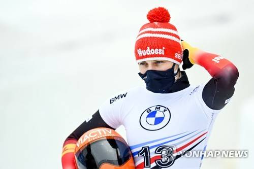 epa08939063 Tina Hermann of Germany reacts after winning the women's Skeleton World Cup event in St. Moritz, Switzerland, 15 January 2021. EPA/GIAN EHRENZELLER