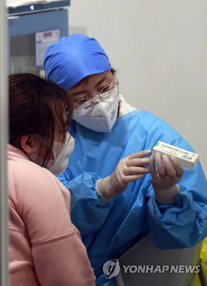 (베이징=연합뉴스) 김윤구 특파원 = 15일 중국 베이징 차오양구에서 의료진이 신종 코로나바이러스 감염증(코로나19) 백신 접종 희망자에게 백신에 대해 설명하고 있다. 2021. 1. 15.