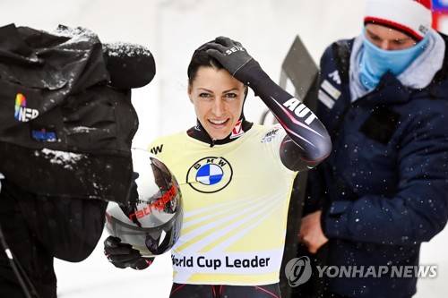 epa08939069 Janine Flock of Austria reacts after taking the second place in the women's Skeleton World Cup event in St. Moritz, Switzerland, 15 January 2021. EPA/GIAN EHRENZELLER