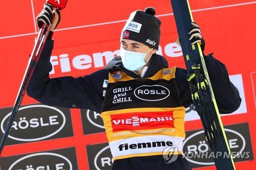 epa08939071 Jarl Magnus Riiber of Norway celebrates on the podium after winning the men's Gundersen NH/10km competition at the FIS Nordic Combined World Cup in Val di Fiemme, Italy, 15 January 2021. EPA/ANDREA SOLERO