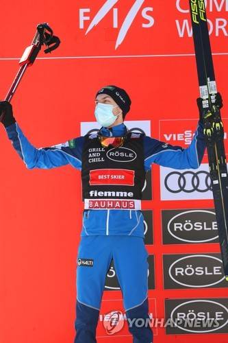 epa08939073 Ilkka Herola of Finland celebrates on the podium after taking the second place in the men's Gundersen NH/10km competition at the FIS Nordic Combined World Cup in Val di Fiemme, Italy, 15 January 2021. EPA/ANDREA SOLERO