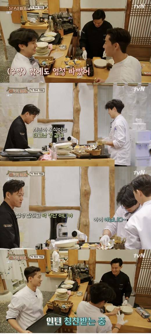 이날 디저트를 준비하던 중 최우식은 박서준에 "형 (주방) 밖에도 엄청 바빴다"라고 고충을 털어놨고, 박서준은 "인생 실전이다"라면서 장난스럽게 답했다.