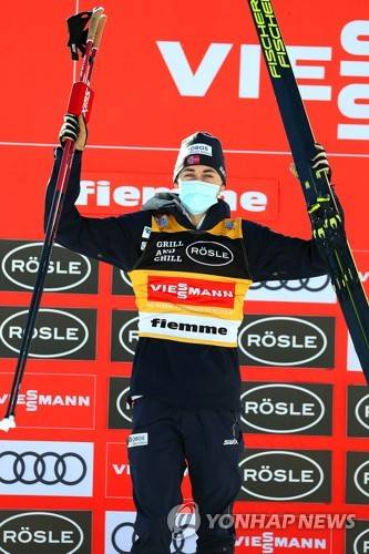 epa08939079 Jarl Magnus Riiber of Norway celebrates on the podium after winning the men's Gundersen NH/10km competition at the FIS Nordic Combined World Cup in Val di Fiemme, Italy, 15 January 2021. EPA/ANDREA SOLERO
