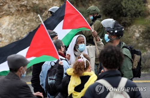epa08939096 Palestinians argue with Israeli soldiers during a demonstration against Israeli settlements in the West Bank village of Toane, south of Hebron, 15 January 2021. EPA/ABED AL HASHLAMOUN