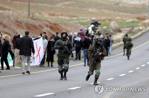 epa08939108 Israeli soldiers disperse Palestinians during a demonstration against Israeli settlements in the West Bank village of Toane, south of Hebron, 15 January 2021. EPA/ABED AL HASHLAMOUN