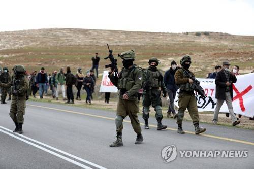 epa08939107 Israeli soldiers disperse Palestinians during a demonstration against Israeli settlements in the West Bank village of Toane, south of Hebron, 15 January 2021. EPA/ABED AL HASHLAMOUN