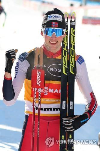 epa08939114 Jarl Magnus Riiber of Norway celebrates in the finish area after winning the men's Gundersen NH/10km competition at the FIS Nordic Combined World Cup in Val di Fiemme, Italy, 15 January 2021. EPA/ANDREA SOLERO