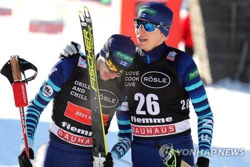 epa08939117 Ilkka Herola (L) of Finland celebrates with his teammate Eero Hirvonen (R) in the finish area after taking the second place in the men's Gundersen NH/10km competition at the FIS Nordic Combined World Cup in Val di Fiemme, Italy, 15 January 2021. EPA/ANDREA SOLERO
