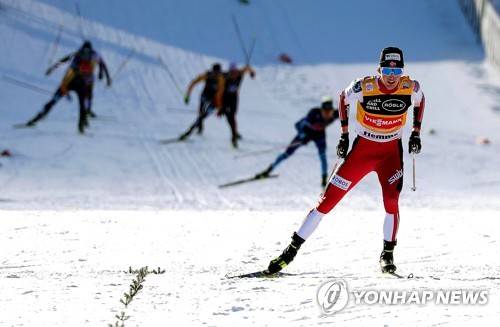 epa08939122 Jarl Magnus Riiber (front) of Norway is on his way to win the men's Gundersen NH/10km competition at the FIS Nordic Combined World Cup in Val di Fiemme, Italy, 15 January 2021. EPA/ANDREA SOLERO