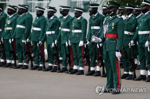 epa08939158 Nigerian military officers wear masks as they stand in line during a military parade for the fallen heroes at the Tafawa Balewa military arcade in Lagos, Nigeria, 15 January 2021. The Nigerian military celebrates fallen heroes in the ceremony that includes laying of wreaths, a military parade, and gun salutes. EPA/AKINTUNDE AKINLEYE