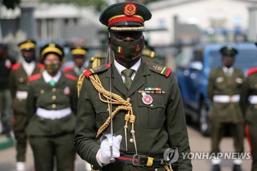 epa08939157 A military legion member wears a face mask as he stands in line during a military parade for the fallen heroes at the Tafawa Balewa military arcade in Lagos, Nigeria, 15 January 2021. The Nigerian military celebrates fallen heroes in the ceremony that includes laying of wreaths, a military parade, and gun salutes. EPA/AKINTUNDE AKINLEYE