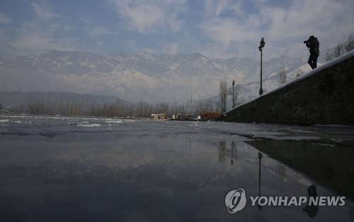 epa08939196 A Kashmiri photographer takes picture of the frozen ice on the waters of Dal Lake in Srinagar, the summer capital of Indian Kashmir, 15 January 2021. Kashmir is witnessing an intense cold wave with major parts of water bodies and water supply pipes freezing creating hardships for locals. EPA/FAROOQ KHAN