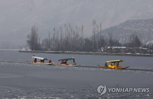 epa08939188 Kashmiri boatmen row their boats on the frozen ice waters of the Dal Lake in Srinagar, the summer capital of Indian Kashmir, 15 January 2021. Kashmir is witnessing an intense cold wave with major parts of water bodies and water supply pipes freezing creating hardships for locals. EPA/FAROOQ KHAN