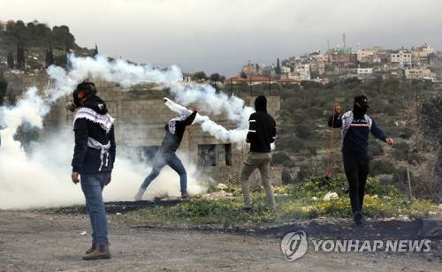 epa08939213 Palestinian protesters throw stones at Israeli troops during clashes after a demonstration against Israel's settlements in the village of Kofr Qadom, near the northern West Bank city of Nablus, 15 January 2021. At least 22 Palestinians were wounded by tear gas and rubber bullets. EPA/ALAA BADARNEH