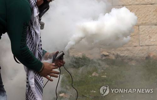 epa08939215 Palestinian protester uses his sling shot to throw back a tear gas grenade at Israeli troops during clashes after a demonstration against Israel's settlements in the village of Kofr Qadom, near the northern West Bank city of Nablus, 15 January 2021. At least 22 Palestinians were wounded by tear gas and rubber bullets. EPA/ALAA BADARNEH