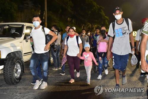epa08939244 Hondurans leave in a new caravan of migrants from the Great Metropolitan Central of San Pedro Sula, Honduras, 15 January 2021. More than 3,000 Honduran migrants left in a caravan to the United States, where they hope to arrive despite warnings from the governments of USA, Guatemala and Mexico that they will not allow the entry of people who try to cross irregularly. EPA/JOSE VALLE