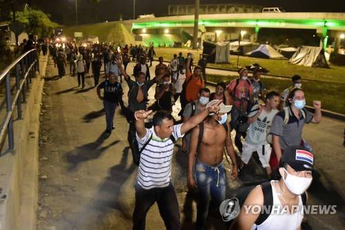 epa08939242 Hondurans leave in a new caravan of migrants from the Great Metropolitan Central of San Pedro Sula, Honduras, 15 January 2021. More than 3,000 Honduran migrants left in a caravan to the United States, where they hope to arrive despite warnings from the governments of USA, Guatemala and Mexico that they will not allow the entry of people who try to cross irregularly. EPA/JOSE VALLE