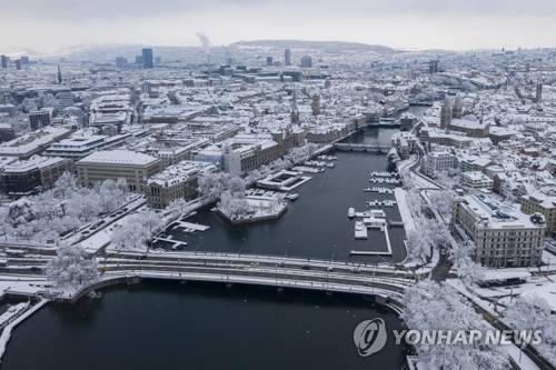 epa08939262 View of the inner-city of Zurich with the river Limmat and the Grossmuenster church (R), in Zurich, Switzerland, 15 January 2021. Record-breaking amounts of fresh snow have fallen in parts of Switzerland since Wednesday, with a massive impact on traffic. EPA/ENNIO LEANZA