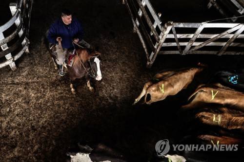 epa08939306 Cows wait in a corral to be transferred to a refrigerator for their slaughter, at the Hacienda de Liniers Market, in Buenos Aires, Argentina, 12 January 2021 (issued 15 January). The consumption of beef by Argentines, whose table can not miss the roast, fell to its historical minimum in 2020, about 49.7 kilograms per person, due to the fall in purchasing power and an opening towards chicken meat and pork. EPA/JUAN IGNACIO RONCORONI