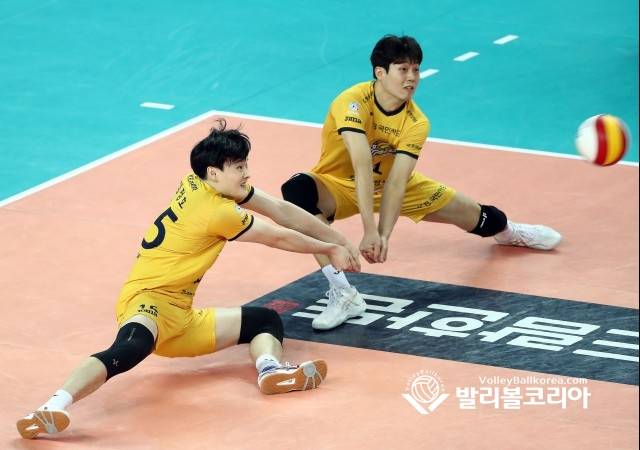 【발리볼코리아닷컴(인천)=김경수 기자】 15일(금) 인천 계양구 계양체육관에서 열린 프로배구 2020-2021 V리그 4라운드 남자부 대한항공 vs KB손해보험 인천경기에서 KB손해보험 김정호와 정동근이 대한항공 강서브를 리시브하고 있다. 2021. 1. 15.