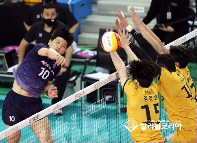 【발리볼코리아닷컴(인천)=김경수 기자】 15일(금) 인천 계양구 계양체육관에서 열린 프로배구 2020-2021 V리그 4라운드 남자부 대한항공 vs KB손해보험 인천경기에서 대한항공 정지석의 후위공격을 KB손해보험 김정호, 구도현, 황택의가 블로킹 하고 있다. 2021. 1. 15.