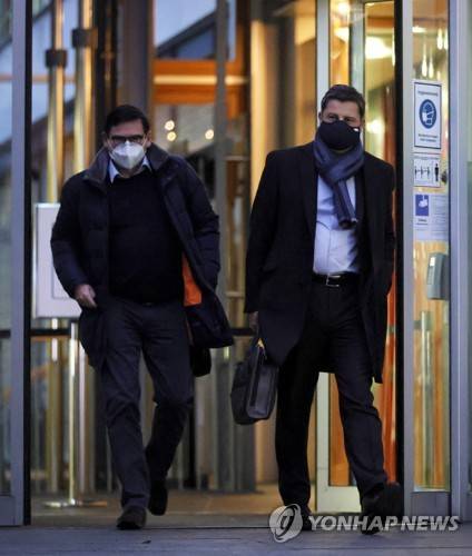 epa08939490 German Football League (DFL) chief executive Christian Seifert (R) and Oliver Leki, Deputy Chairman of the Supervisory Board of DFL leave the German football federation (DFB) headquarters after an extraordinary meeting of the DFB Executive Committee in Frankfurt, Germany, 15 January 2021. EPA/RONALD WITTEK