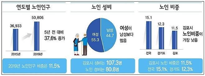 15일 김포시가 공표한 '2020 노인등록통계'를 보면 2019년 말 기준으로 노인 인구는 5만806명으로 전체 인구 대비 11.5% 수준이다.