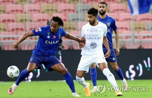 epa08940031 Al-Ahli's player Hussain Al Moqahwi (R) in action against Al-Hilal's Andre Carrillo (L) during the Saudi Professional League soccer match between Al-Ahli and Al-Hilal at King Abdullah Sport City Stadium, 30 kilometers north of Jeddah, Saudi Arabia, 15 January 2021. EPA/STR