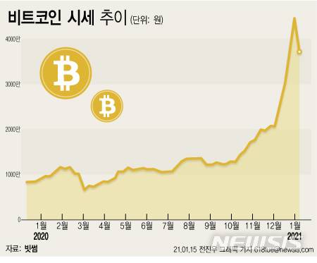 ![[서울=뉴시스] 이영환 기자 = 4일 서울 강남구 빗썸 강남 고객상담센터에 비트코인 시세가 표시되어 있다. 비트코인 가격은 지난 12월 27일 3000만원을 넘어섰고 새해 들어서도 급등세를 보이며 3700~3900만원 사이를 넘나들고 있다. 2021.01.04. 20hwan@newsis.com](https://img1.daumcdn.net/thumb/R658x0.q70/?fname=https://t1.daumcdn.net/news/202101/16/newsis/20210116050028762zaas.jpg)