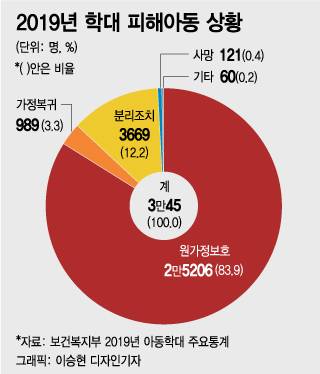 문제는 가해 부모가 있는 원 가정에 복귀한 아이들이 또다시 학대에 노출될 수 있다는 점이다. 복지부 2019 아동학대 주요통계에 따르면 재학대 사례 3431건 중 부모에 의한 재학대 사례가 3244건(94.5%)으로 월등히 높았다.