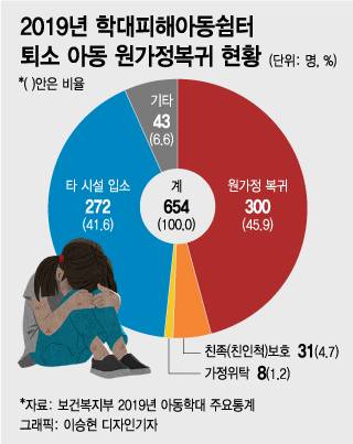 수개월 정도의 단기간만 수용이 가능한 쉼터는 일정 기간이 지나면 나와야 한다. 쉼터에서 나온 아이들은 원 가정으로 돌아가는 경우가 절반 가량이다. 2019년 기준 학대피해아동쉼터에서 보호를 받고 퇴소한 아동 전체 654명 중 원가정 복귀한 아동은 300명(45.9%)이었다.