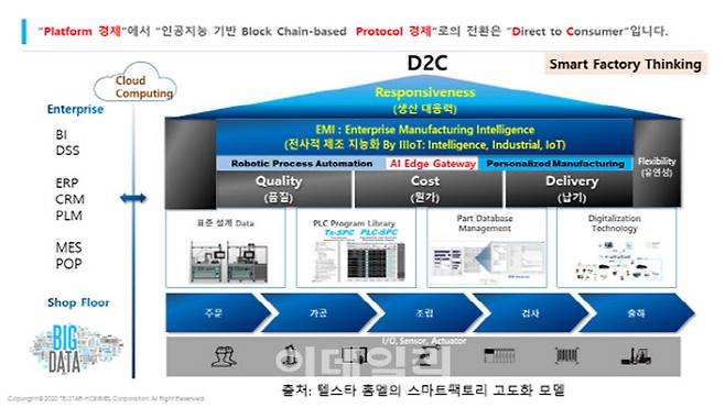 제품 생산만 담당하던 공장이 데이터를 활용하여 제어하고 그로 인해 수집된 데이터를 통해 고객 맞춤형 생산과 공급망 관리(SCM)가 가능해지면, 그 기업이 갖게 될 경쟁력은 막강해질 것이고, 고객은 자신에게 맞는 제품과 서비스를 제공받게 될 것이다. 빅 데이터와 인공지능 기술 역량을 통해 선진 기업들은 이미 새로운 네트워크 기반에서 각자 독특한 플랫폼(Direct to Consumer) 사업을 전개하고, 데이터 기반 ICT융합기술을 활용하여 판매 감소의 위기를 극복하고 있다.