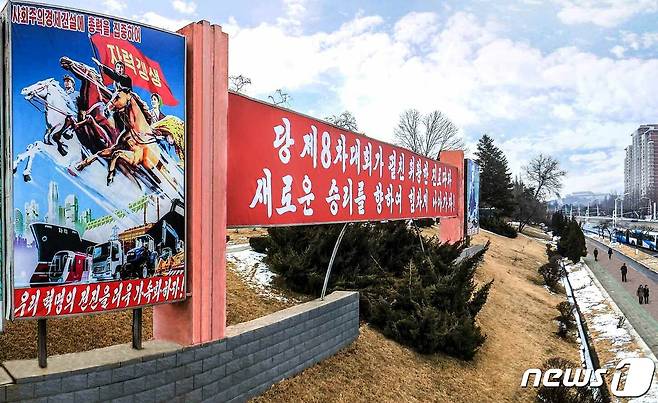 (평양 노동신문=뉴스1) = 북한이 제8차 노동당 대회 결정 관철을 위한 투쟁에 떨쳐나섰다고 당 기관지 노동신문이 16일 보도했다. 사진 속 평양 거리에는 '당 제8차 대회가 펼친 휘황한 진로따라 새로운 승리를 향하여 힘차게 나아가자!'라고 적힌 선전물이 세워져 있다.