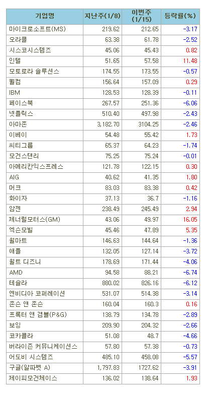 [표]미국 주요기업 주간 등락률
