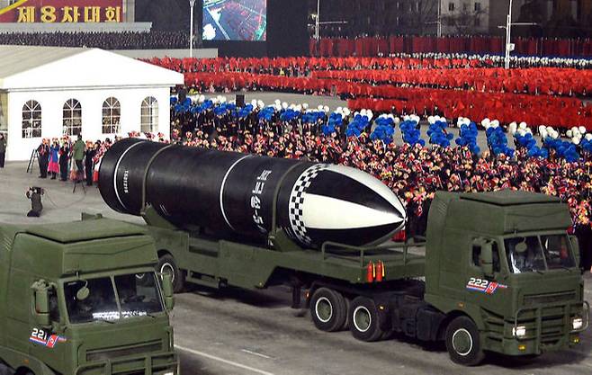 | 무력 과시하는 北 14일 저녁 평양 김일성광장에서 열린 북한 8차 노동당 대회 기념 열병식에서 ‘북극성-5ㅅ(시옷)’이라는 문구가 적힌 신형 잠수함발사탄도미사일(SLBM)이 트레일러에 실려 이동하고 있다. 조선중앙통신 홈페이지 캡처 연합뉴스 |