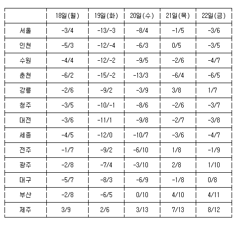 16일 기상청에 따르면 19일∼20일 아침 기온은 -15∼0도, 낮 기온은 -4∼10도로 15일(아침 -6∼7도, 낮 8∼16도) 기온보다 낮아 춥겠다.