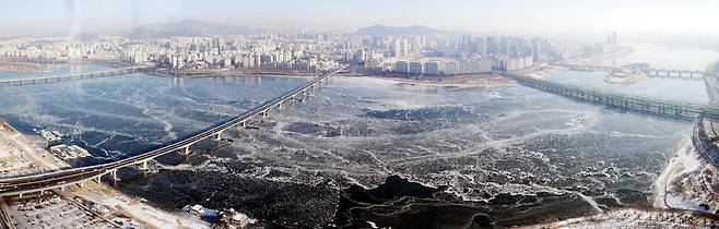 열흘 넘게 북극발 한파가 이어진 10일 오전 서울 여의도 63빌딩 전망대에서 내려다본 마포대교(맨 왼쪽)에서 한강대교(맨 오른쪽) 사이 강물이 얼어 있다. 기상청은 지난 9일 이번 겨울 들어 처음으로 ‘한강 결빙’이 관측됐다고 밝혔다. 한강대교 둘째와 넷째 교각 상류 100m 부근의 띠 모양 구역이 완전히 얼음으로 덮여 강물이 보이지 않을 때 ‘한강 결빙’으로 판단한다. 기상청은 이번 추위가 12일까지 이어질 것으로 내다봤다. 촬영한 사진 5장을 파노라마 기법으로 이어 붙였다. 김혜윤 기자 unique@hani.co.kr
