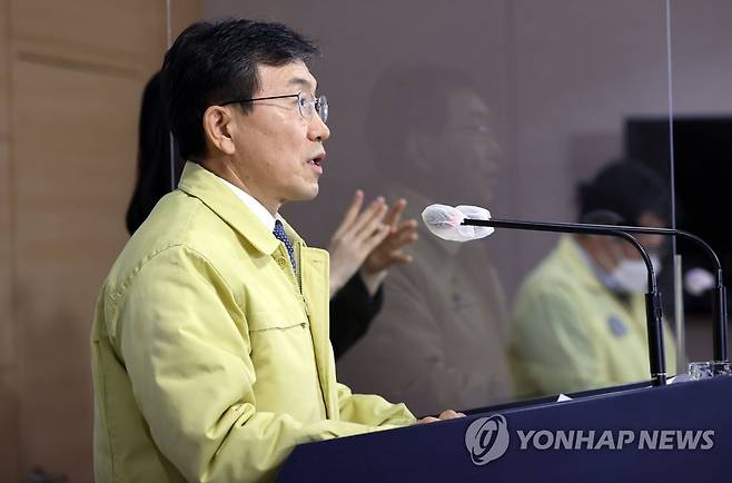 (서울=연합뉴스) 김인철 기자 = 권덕철 중앙재난안전대책본부 1차장(보건복지부 장관)이 16일 오전 정부서울청사에서 사회적 거리두기 단계 연장 조치 및 세부 조정안을 발표하고 있다. 2021.1.16