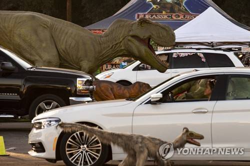 epaselect epa08940670 Visitors drive past real-size animated dinosaurs at the Jurassic Quest attraction at the Rose Bowl in Pasadena, North-East of Los Angeles, California, USA, 15 January 2021. The exhibition runs from 15 January through to 31January 2021. EPA/ETIENNE LAURENT